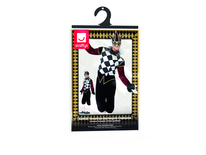 Erwachsenenkostüm Venezianischer Gothic-Harlekin, mit Oberteil, Hose und Kragen