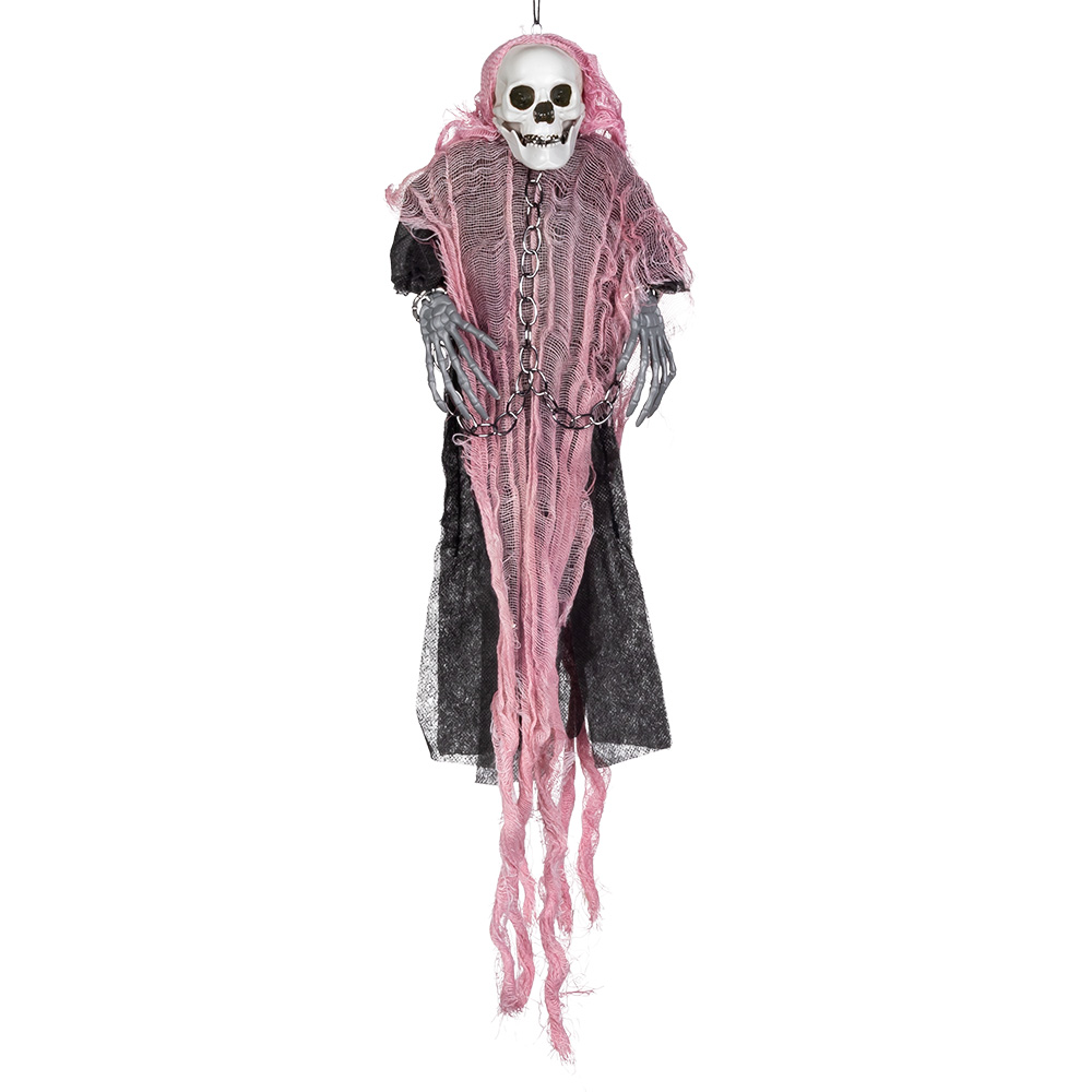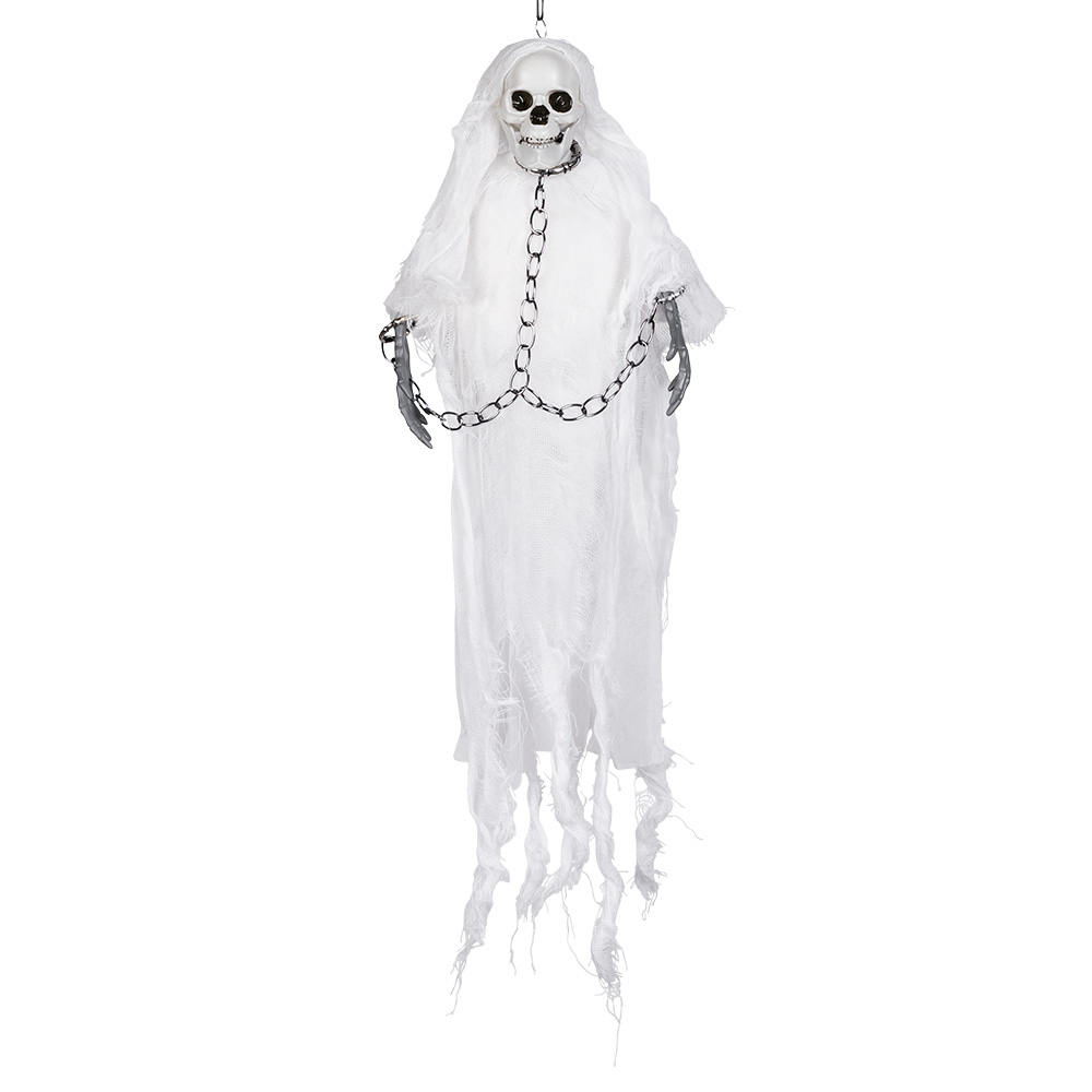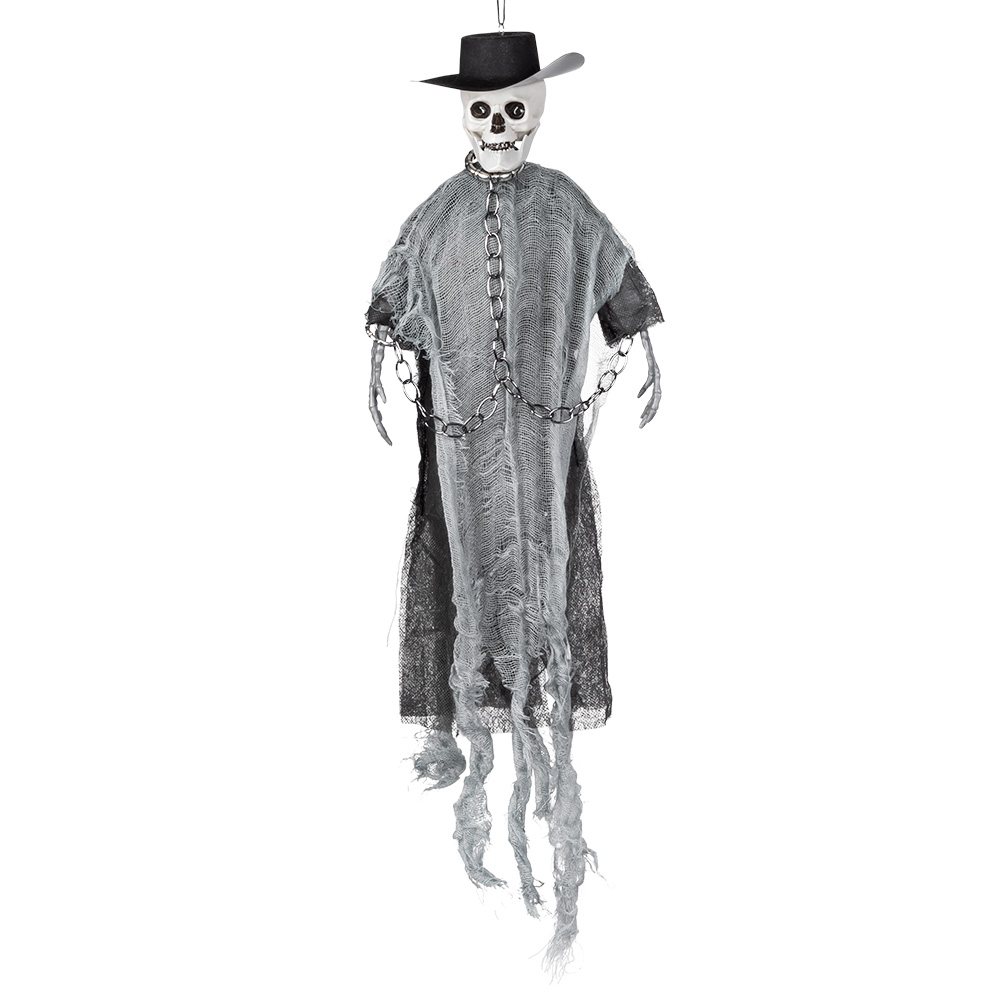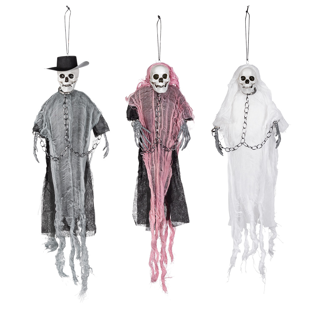 Ein Sortiment von 3 gruseligen angeketteten Siedlerdekorationsskeletten. Das Sortiment besteht aus einem Skelett mit Priester-Outfit und 2 weiblichen Skeletten mit Kleid. Mit der praktischen Schlaufe können die Skelette einfach aufgehängt werden und eignen sich daher perfekt als Dekoration für Halloween.