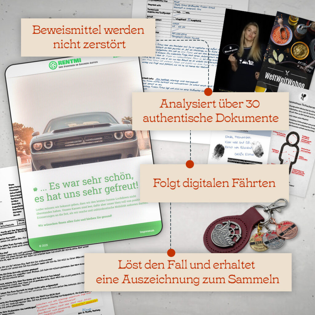 Als Mitglieder der SOKO UNVERGESSEN um Inspektor Karl Klugmann seid ihr in die Ermittlungen involviert. Vertieft euch in die Ermittlungsakten, benutzt das Polizeiportal P.I.C.A., geht jedem noch so unbedeutend erscheinendem Hinweis nach und zieht Schlüsse aus alten und neuen Erkenntnissen. Dank eurer Mitarbeit kann das Verbrechen vielleicht doch noch aufgeklärt werden.